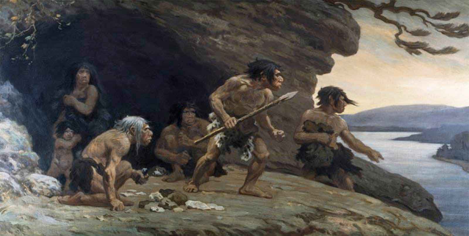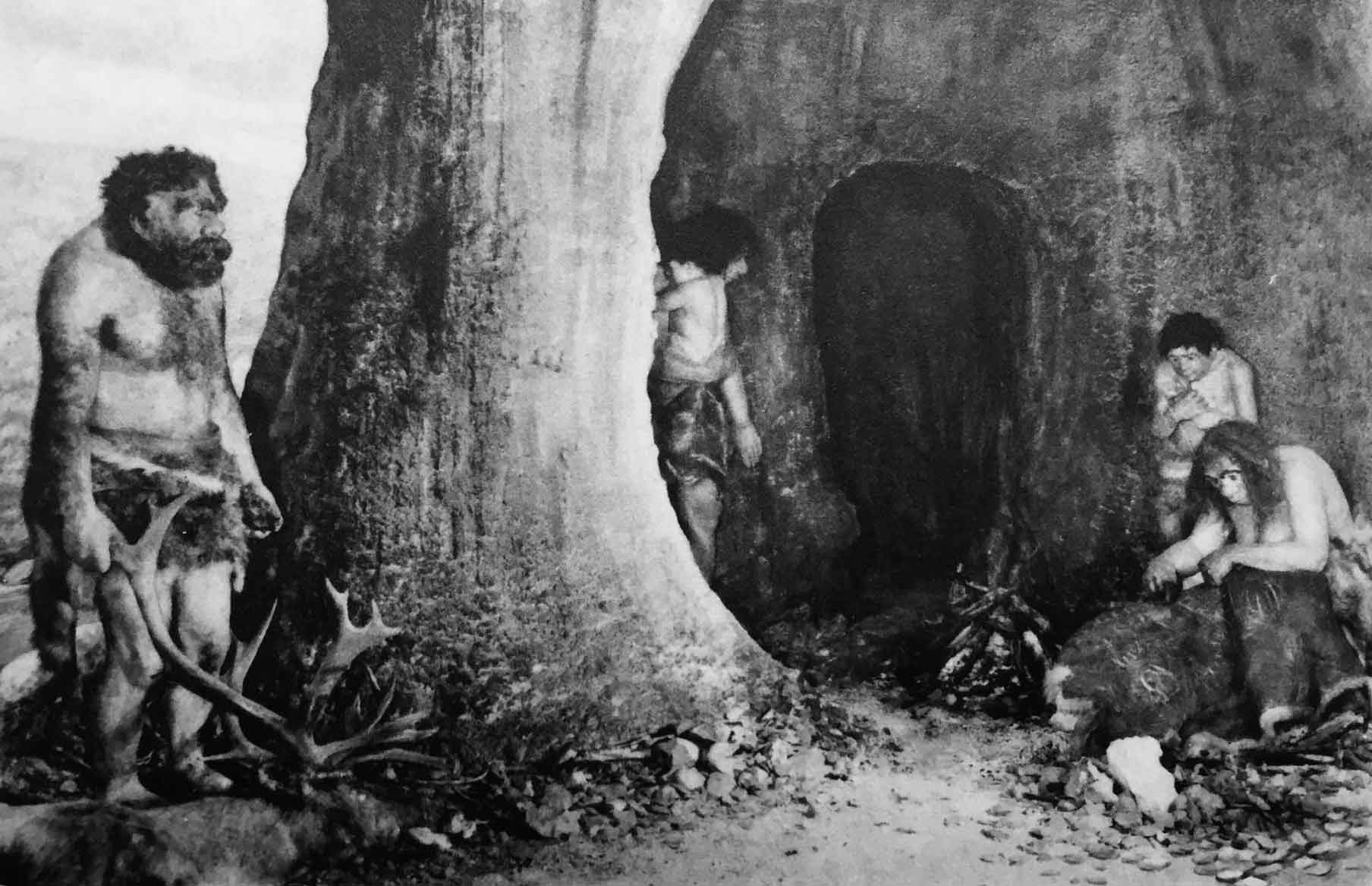 Charles Knight's 1920 painting, “Neanderthal Flintworkers, Le Moustier Cavern, Dordogne, France”. Image: American Museum of Natural History