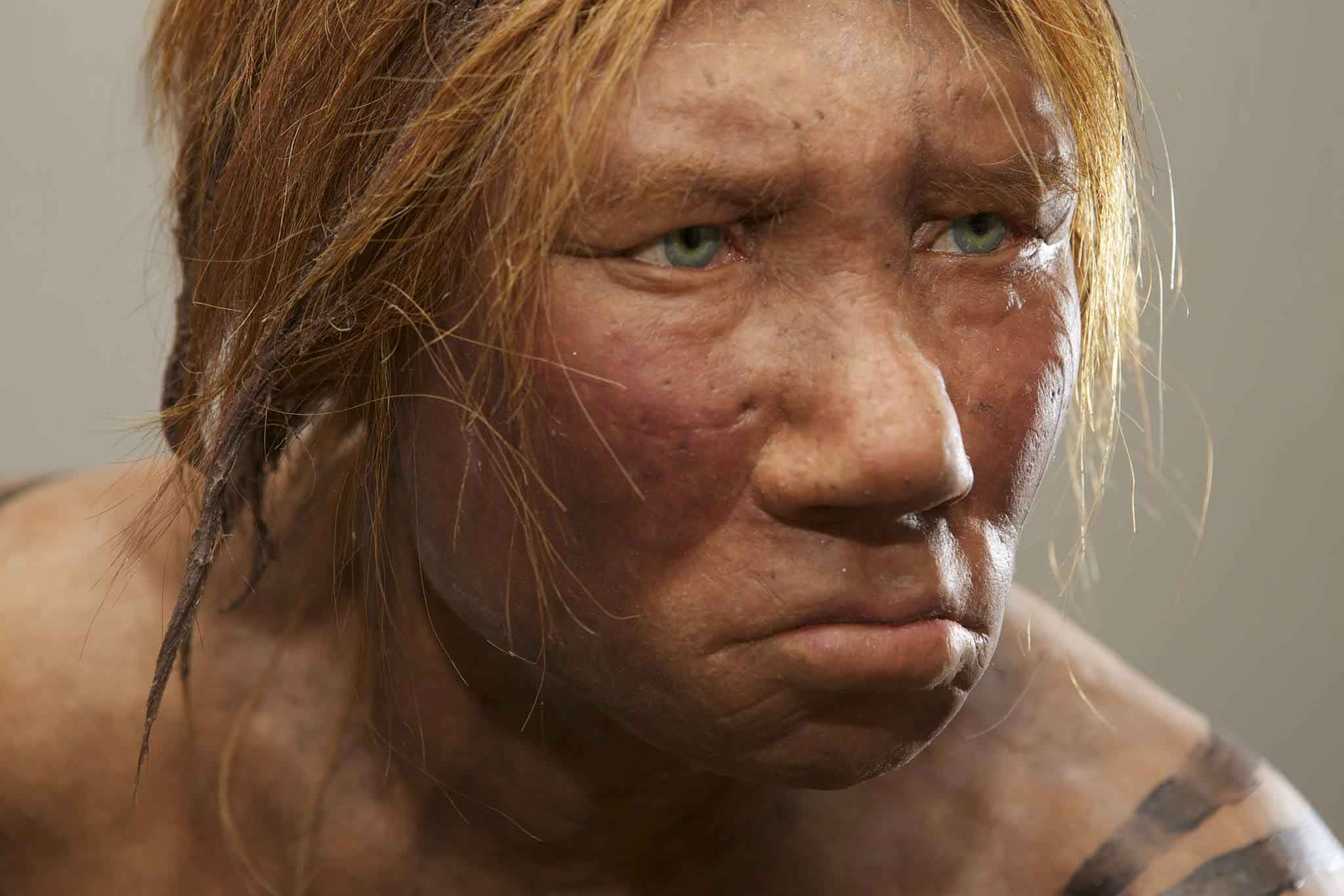 Closeup of the “Wilma” Neandertal life rendering by Alfons and Adrie Kennis, depicted with red hair, light skin, and blue eyes. Photo: National Geographic