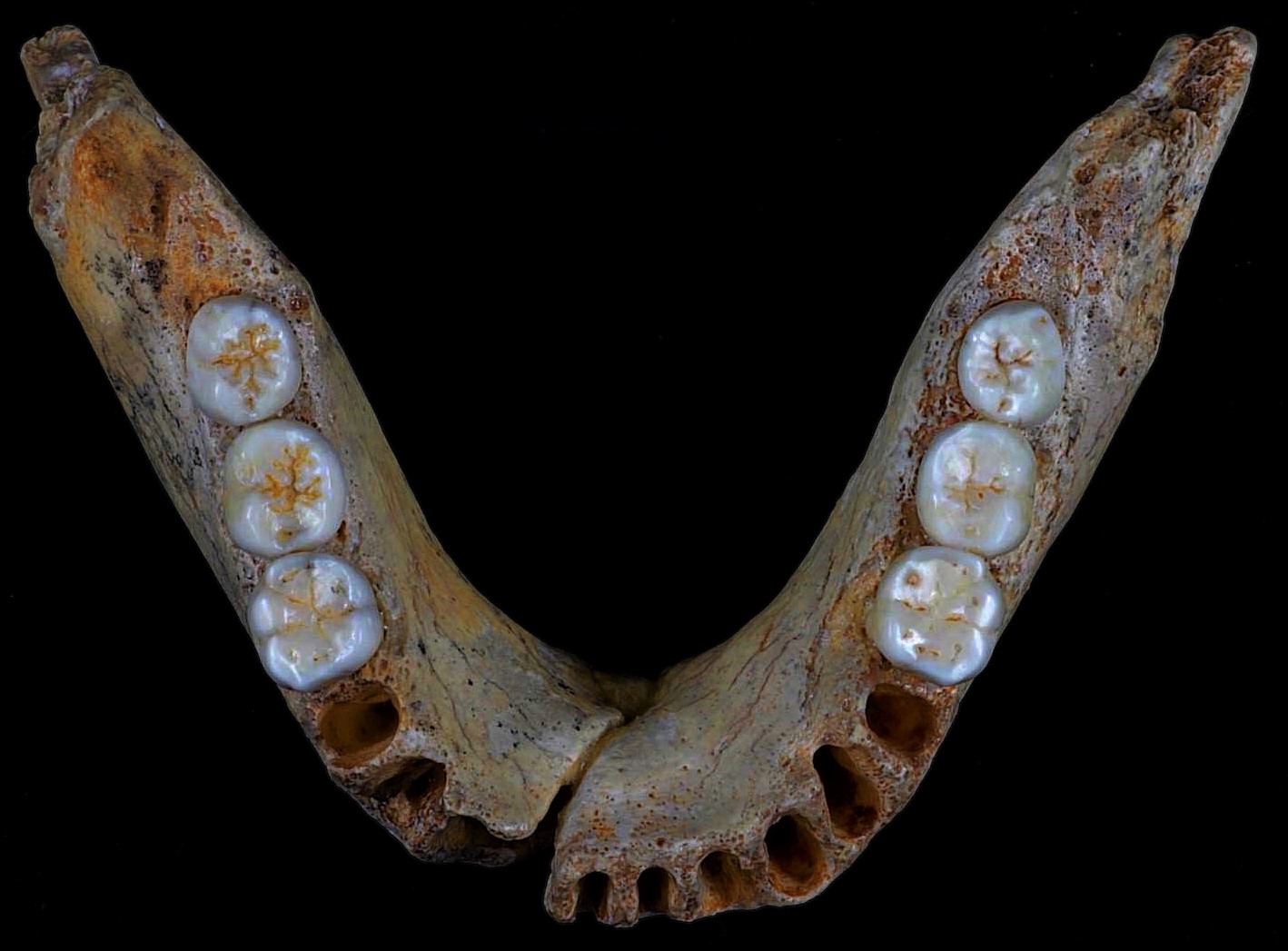 Foto 4: Primera fotografía (sin escala) de la primera mandíbula humana de la Sima de los Huesos. La fractura reciente, todavía sin restaurar se aprecia claramente.