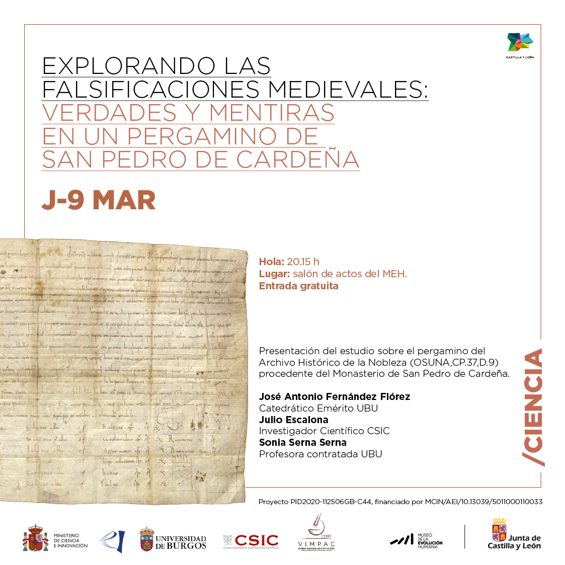 En la presentación intervendrá el catedrático emérito de la Universidad de Burgos (UBU) José Antonio Fernández Flórez, más los autores del estudio: los investigadores Sonia Serna (UBU) y Julio Escalona (CSIC). Comenzando por un breve estado de cuestión sobre la importancia de la detección de los documentos falsos o inauténticos, se expondrán algunos casos de relevancia sobre falsificaciones en la documentación medieval peninsular, para finalmente centrarse en el documento protagonista, el pergamino OSUNA, CP.37, D.9. El encuentro comenzará a las 20.15 horas en el salón de actos del Museo, con entrada libre hasta completar aforo. Es preferible reservar con antelación la invitación en la recepción del Museo o llamando al 947421000. Se podrá seguir en directo a través del canal de youtube del Museo