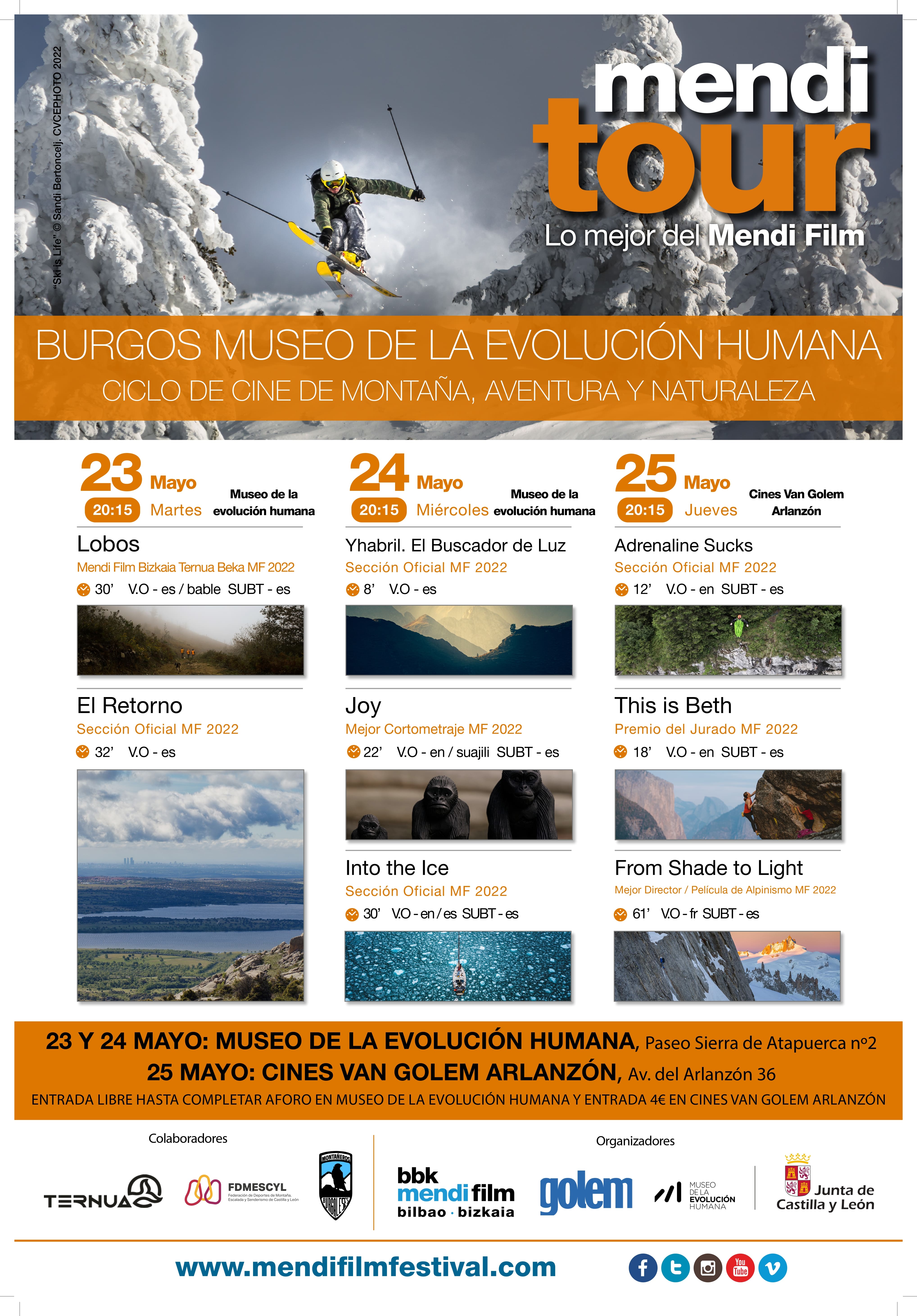 El Museo de la Evolución Humana y los Cines ‘Van Golem’ mostrarán una selección de películas del Festival de Cine de Montaña, Deportes Extremos y Naturaleza ‘Mendi Tour’. El martes y el miércoles, 23 y 24 de mayo, el MEH proyectará lo más destacado de este festival, que cumple este año su decimosexta edición, siendo una de las citas más reconocidas a nivel internacional (el año pasado estuvo presente en 50 sedes distintas). Por su parte, el jueves, 25 de mayo, los cines Van Golem proyectarán otras tres películas del festival.